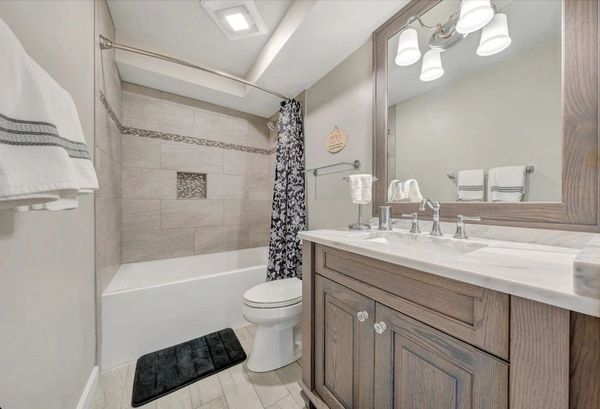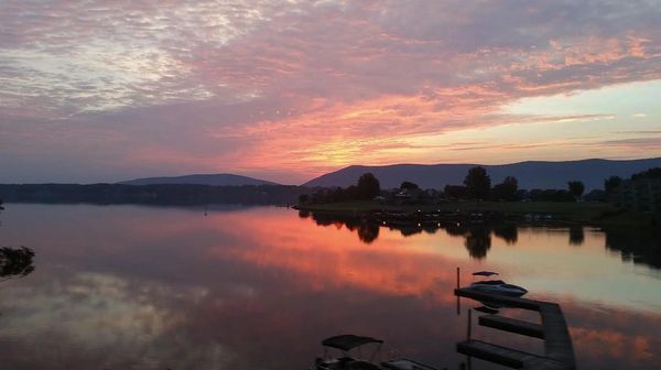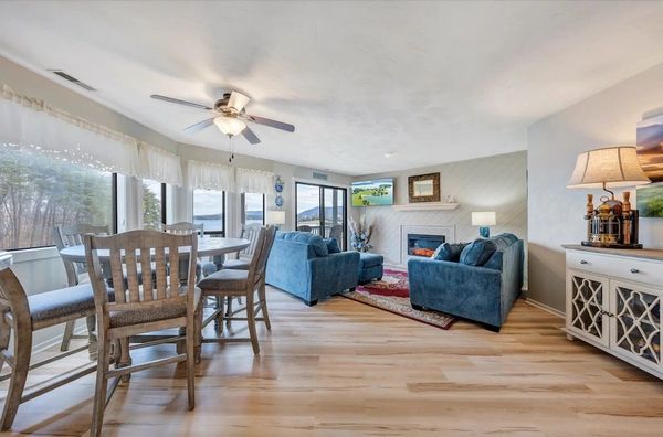 The mornings are spectacular here at Smith Mountain Lake! This vacation home is so close to the water, when you look out of the windows all you see is water with the backdrop of Smith Mountain itself. This 2 bedroom vacation rental has a king and queen bed, and a queen sleeper sofa. There's a large TV, newly remodeled bathrooms. There is docking out front plus a little beach, so bring your kayak and boat or rent both on site.